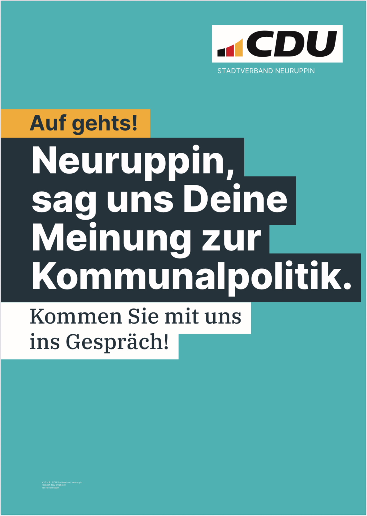 vielen Dank für Ihren Besuch auf den Internetseiten des CDU Stadtverbandes Neuruppin. Wir bieten Ihnen zu aktuellen wie auch zu zurückliegenden Themen Informationen. Falls Sie darüber hinaus noch Fragen oder Anregungen haben sind wir gerne für Sie da.